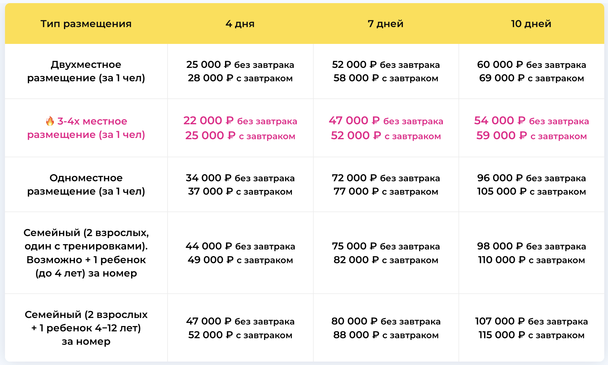 Семейный (2 взрослых, один с тренировками). Возможно + 1 ребенок (до 4 лет) за номер
